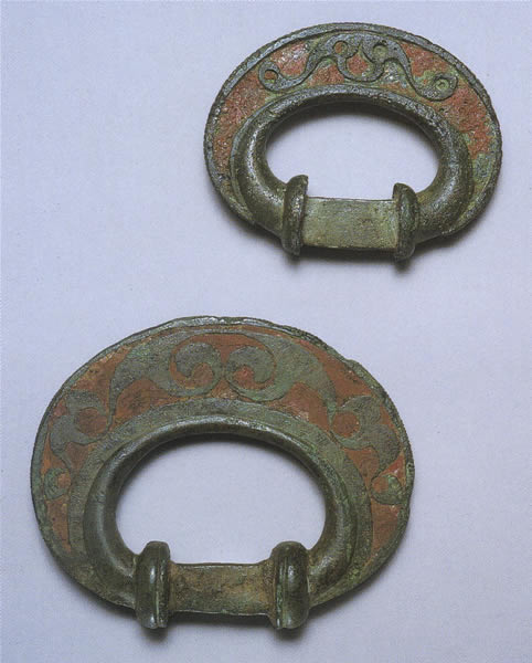 (a)は文様の同一性に基づき一揃いをなしたと推定される5点の手綱を通す輪の一つで、両面に同じ文様を施している。左右相称の文様は鋳造前に粘土の鋳型にすでに準備されていた。くぼみ部分のエマーユは、吹管を使って温度を調節しながら行った。文様帯の下部には点刻で三角形を連ねている。(b)は揃いをなす3点のうちの一つで、やはり両面に同一の文様を装飾している。文様の目の部分は鋳週後削り取り、ここにも赤エマーユを施している。ブロンズ製の椀に入って見つかったウエストホール・ホードはファウスティーナの貨幣を伴出したため、その夫アント二ヌス・ピウス帝の即位した紀元138年以後に位置づけられる。出所:「古代ヨーロッパの至宝-ゲルト美術展1998」