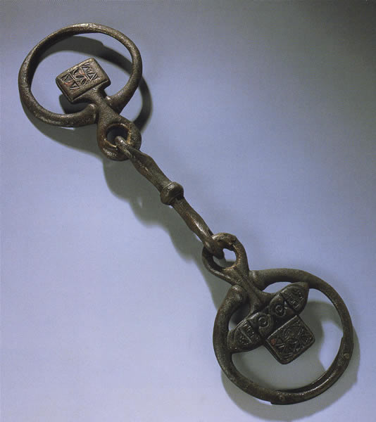 馬の頬に当たる部分に赤と青のエマーユが施されていた。一方の輪と繋ぎ部分には馬の顔が暗示されている。磨滅が激しく、鋲と鋳掛けによる補修がなされている。小型で、ポ二ー用と推定される。 1785年に泥炭地で発見された。出所:「古代ヨーロッパの至宝-ゲルト美術展1998」