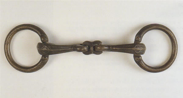 連結部品の内側の端には鳥の頭部を象り、外側の端にはパルメット・リュラー文を浮き出させている。このタイプの轡は二頭のポ二一に馬車を牽かせるのに使ったため、一対で出土することが多い。出所:「古代ヨーロッパの至宝-ゲルト美術展1998」