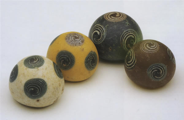 1965年家屋の建設中に、豊かな副葬品を伴う火葬墓が発見された。出土した一揃い241点のゲーム玉の内から、色違いの4点を展示する。それぞれ不透明白・黄・青、および半透明緑で、目玉を五つあしらっている。目玉はいずれも不通明白と半透明の暗緑色または暗赤色とによる旋回モチーフである。ガラスを加熱成形するための金属棒ポンテの跡が底面に残っている。四人で遊ぶゲームに使われたと考えられる。おそらく東地中海域で制作され、ガリア経由で紀元前50年から前15年頃、南イングランドの部族長のもとに届いた。出所:「古代ヨーロッパの至宝-ゲルト美術展1998」
