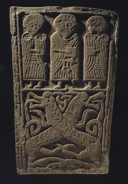 長方形に近い逆台形の両面に浮彫で装飾が施されている。前面の円環を伴う十字架には組紐文を、四隅の区画には幾何学的な組紐文を充填している。裏面は上下二つに区画し、上にはトゥニカと外套を着、書物を携えた三人の修道士を表す中央の人物はさらに何か別の物を提げている。下では二頭の怪獣が対角線状に交差し、互いに相手の長い尻尾に噛みついている。出所:「古代ヨーロッパの至宝-ゲルト美術展1998」