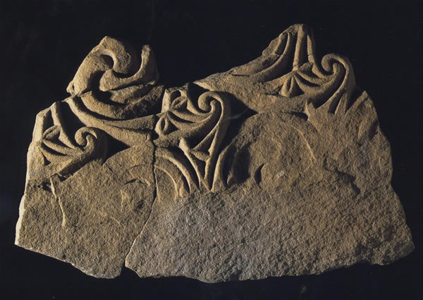 浮彫で表された渦巻文は、「ケルズの書」「リンディスフアーンの福音書」などの装飾写本、あるいは金工品の装飾と共通する。多数の装飾石柱が出土したタルバットにはピクトの修道院があったと考えられる。出所:「古代ヨーロッパの至宝-ゲルト美術展1998」