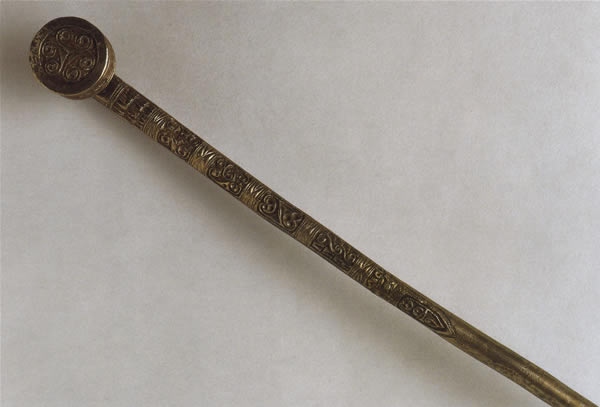 頂部の円形に背中合わせになった三つのペルタ文を表し、棒部分にも枠を作って多様な装飾を展開し、頂部の上にはX形十字がある。装飾モチーフの地には赤エマーユを施している。小さな点の地を残す「お玉杓子の頭」モチーフはCat.224にも適用されている。アイルランドで銀の使用が一般化するのは8世紀以降であることから、おそらくピクト製と考えられる。出所:「古代ヨーロッパの至宝-ゲルト美術展1998」