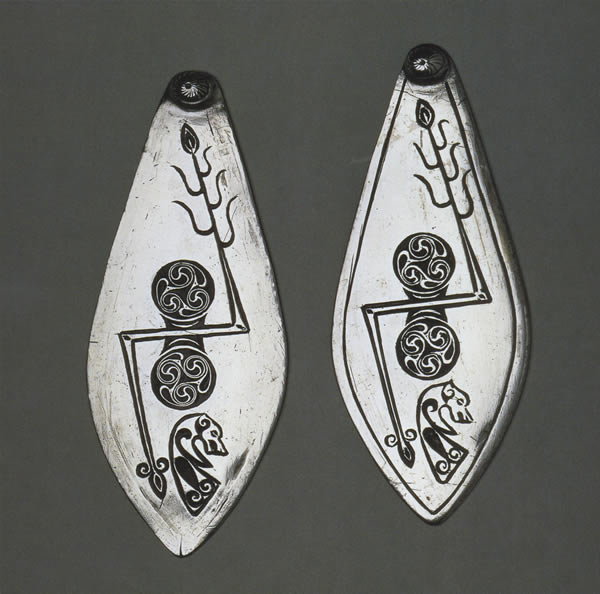 葉の形をした一対の装飾板は互いにほとんど同一である。繋がった二つの円の中には三つずつトリスケーレ連続文を配し、その間を横切る「Z棒」の一端は花ないし木の枝、もう一端はパルメットになっている。下にはおそらく犬を意図した動物の上半身を表すが、これは「リンデイスフアーンの福音書」に類例が見られる。装飾部分には赤エマーユが施されていた。用途は不明である。出所:「古代ヨーロッパの至宝-ゲルト美術展1998」