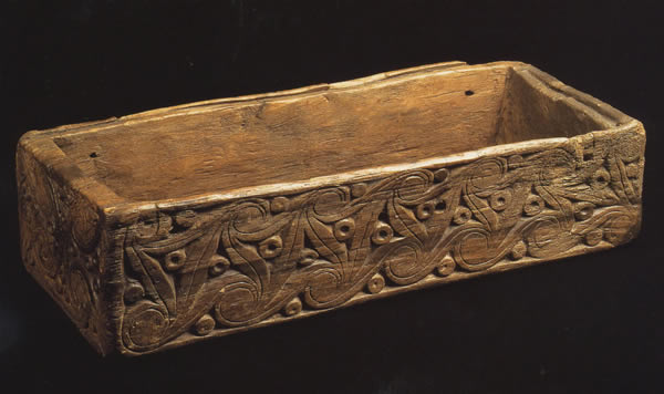 一本のハンノキをくり抜くた直方体の箱の三側面にトリスケーレ連続文を彫っている。ふたは展示されないが、これにも装飾がなされている。泥炭地で発見され、皮革細工の道具が入っていた。出所:「古代ヨーロッパの至宝-ゲルト美術展1998」