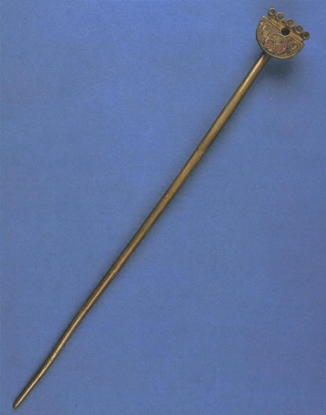 頂部の半球形に三つのペルタ文を組み合わせ、地に赤エマーユを施す側面も赤エマーユの地に魚の骨文、指の先にも赤エマーユを充填している。ハンドピンは初期中世のアイルランドとブリテン島独特の形式である。7世紀まで制作され、その後は他の形式に取って代わられた。出所:「古代ヨーロッパの至宝-ゲルト美術展1998」