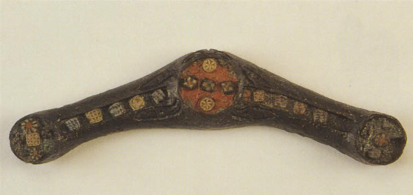 おそらく財布か剣の鞘の装飾部品で、中央と両端の円形部分、およびその間の溝に、エマーユとミッレフィオーリ・ガラスによる華麗な装飾を展開している。両端の円形部分の地は極めて珍しい縁エマーユで、他は赤エマーユである。その中に配されたミッレフィオーりの色は赤・黄・青・白・黒、文様はマリゴールド花文、十字形、市松文、放射状花文など、多彩である。中央の円形の左右と上に鳥の頭部を六つ彫っている。出所:「古代ヨーロッパの至宝-ゲルト美術展1998」