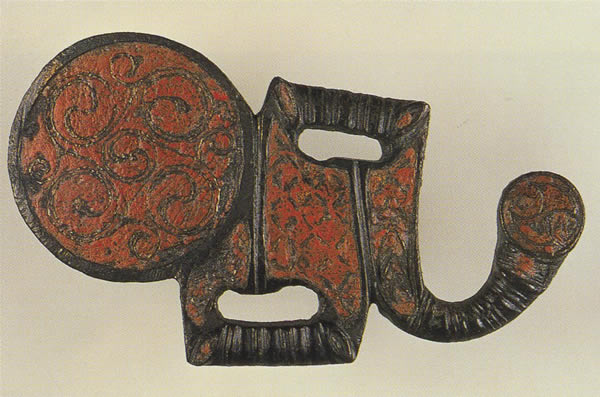大きな円形部分には陰陽文を内包する渦巻文、小さな円形部分にはアーチ形モチーフ、中央部分には菱形文とシェヴロン文(ジグザグ)を装飾し、地には一面に不透明赤エマーユを施している。類品との比較から、二つの穴には服に留めるための螺旋形部品があったと推定される。「ラチェット」という名称は、線形をなす類例が曲がりくねった靴紐を想起させたことに由来する。出所:「古代ヨーロッパの至宝-ゲルト美術展1998」