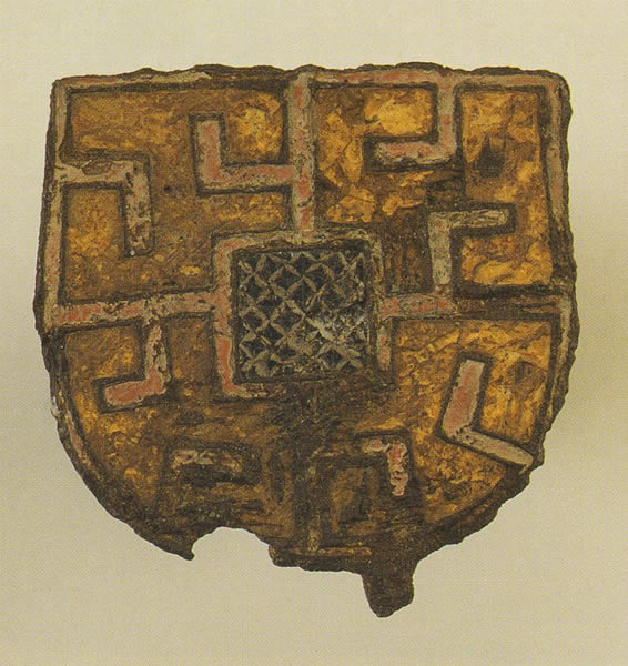 ハンギング・ボウルの鉤の、またはバケツの取っ手の取付部であったと考えられる。中央の正方形の区画に青と白のミッレフィオーリ、その周囲には黄エマーユと鍵形の赤エマーユを配している。出所:「古代ヨーロッパの至宝-ゲルト美術展1998」