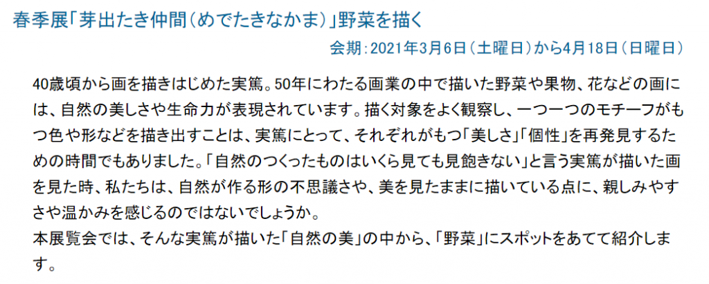 名称:「春季展「芽出たき仲間(めでたきなかま)」野菜を描く」調布市武者小路実篤記念館
