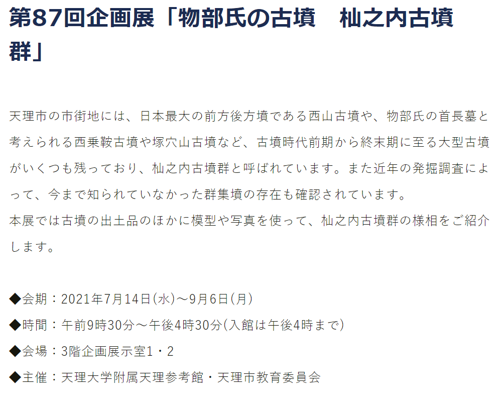 名称:第87回企画展「物部氏の古墳 杣之内古墳群」天理大学附属天理参考館