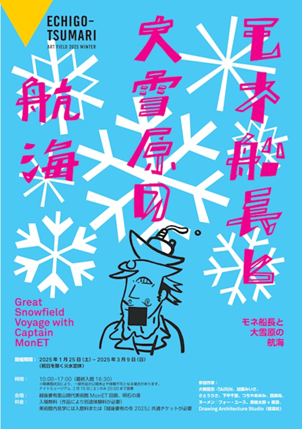 「大地の芸術祭 越後妻有アートトリエンナーレ2024」にて大好評だった「モネ船長と87日間の四角い冒険」のテーマ “未知なる冒険/体験の復権/見果てぬ想像の具現化” を第二弾として展開。継続展示作家を含む国内外9組のアーティストによるサイトスペシフィックな企画展です。風景が一変する冬にしか見ること・体験することができない、作品の新たな表情をぜひお楽しみください。