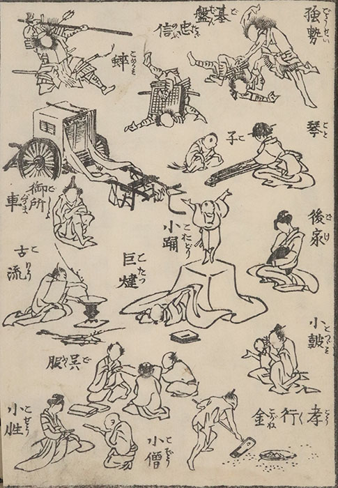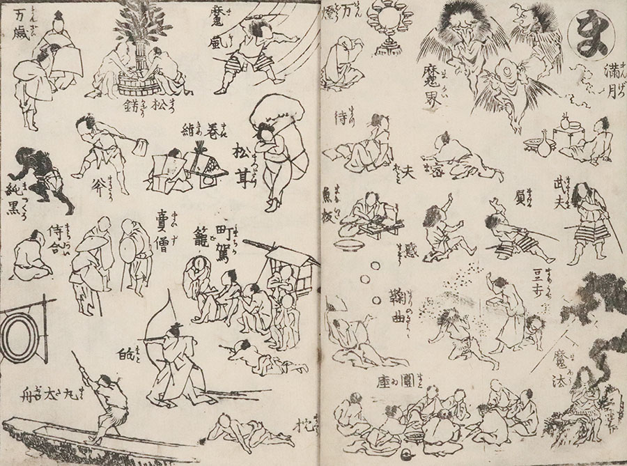 葛飾北斎の絵手本には、略画で描かれたモチーフがしばしば登場します。単純化した線で捉えられた様々なモチーフは、単に簡略に描かれた絵というだけでなく、それ自体が伸びやかな線や柔らかい形の魅力を備えています。本展では、北斎の版本に見られる略画を中心に、文字絵や草体画なども含めてご紹介します。