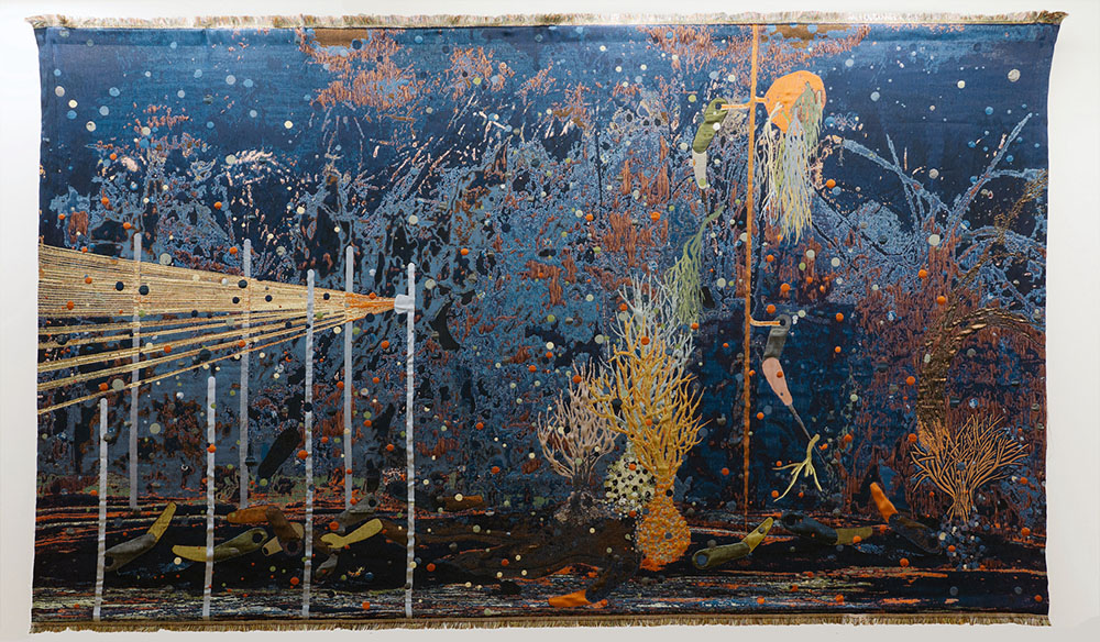 ナイジェリアに生まれ、現在ベルギーを拠点に活動するオトボン・ンカンガは、土や大地、海といった自然環境が人間との関係の中で持つ物語や政治性に焦点を当ててきた。本展では、昨年度に収蔵したンカンガのタペストリーとともに、昨年夏に作家が石川県に滞在し、県内の多様な素材や工芸技術をリサーチした成果として、石川県を中心に活動する作り手たちとコラボレーションした新作を発表する。