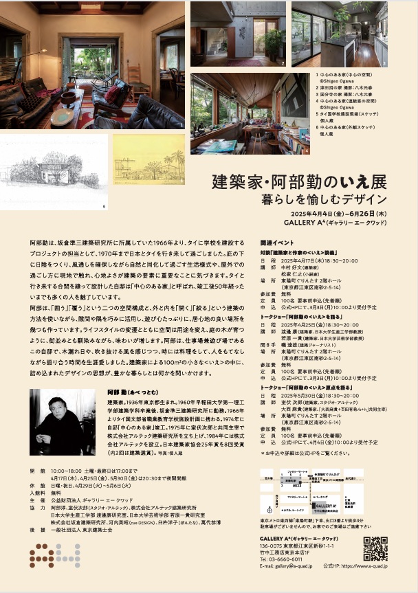 阿部勤は、坂倉準三建築研究所に所属していた1966年より、タイに学校を建設するプロジェクトの担当として、1970年まで日本とタイを行き来して過ごしました。庇の下に日陰をつくり、風通しを確保しながら自然と同化して過ごす生活様式や、屋外での過ごし方に現地で触れ、心地よさが建築の要素に重要なことに気づきます。タイと行き来する合間を縫って設計した自邸は「中心のある家」と呼ばれ、竣工後50年経ったいまでも多くの人を魅了しています。