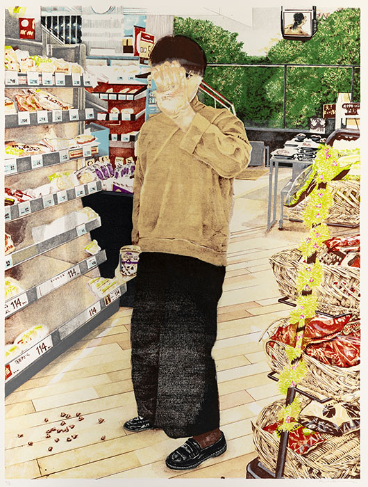 松元は実際にあった事件を取り上げたリトグラフ制作を続けてきました。他方、実際の事件をとりあげると言えども、松元は自らがその事件の当事者にはなりえない「情報の受け手」であることを強調し、事件の現地に赴いたり、法廷画家の仕事で得られた情報を、作家は自らの身体や想像を通した限りで画面に落とし込んでいきます。