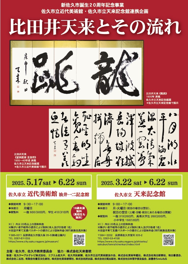 本展覧会は新佐久市誕生20周年記念事業の一環として、佐久市立近代美術館と佐久市立天来記念館の連携企画として開催します。佐久市立近代美術館では、佐久市立天来記念館所蔵の天来の作品と、佐久市立近代美術館および佐久市立天来記念館所蔵の天来の直門たち、そしてその流れを受け継ぐ書家たちの作品を展示します。佐久市立天来記念館では、令和6年度に天来記念館に寄贈された《龍跳》(1920)を軸として、新規寄贈作品を中心に天来とその妻・比田井小琴の作品、そして佐久市立天来記念館と佐久市立近代美術館所蔵の門流の作品を展示します。