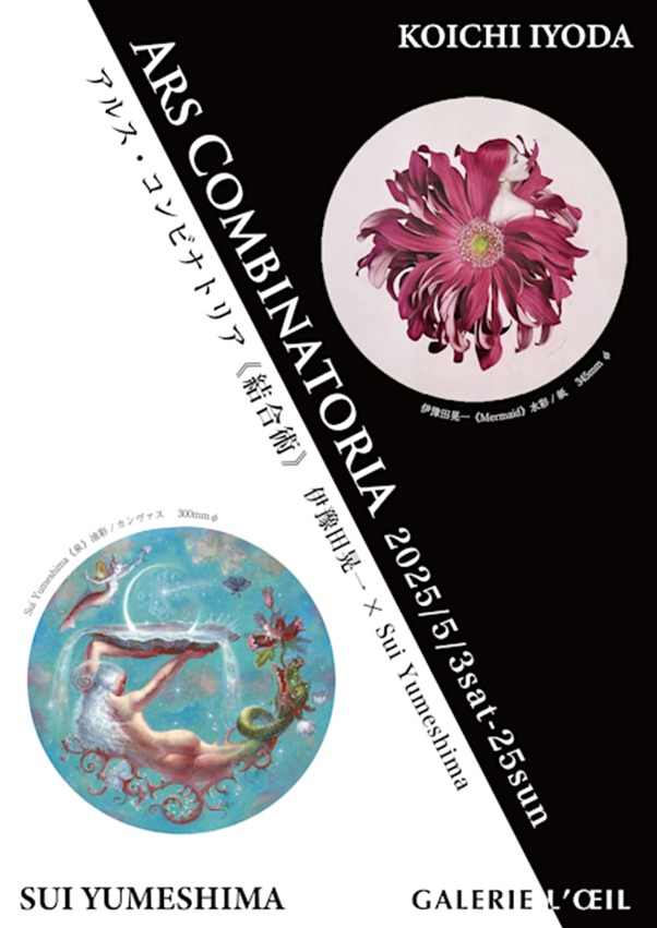 本展は、巧緻な描写力により創意溢れる作品を描く伊豫田晃一と、奔放自在な表現で神秘的・魔術的な世界を描くSui Yumeshimaが、アルス・コンビナトリアをテーマにそれぞれ独自の着想で描いた作品を展示いたします。2人の作品世界の結合もお楽しみいただければ幸いです。