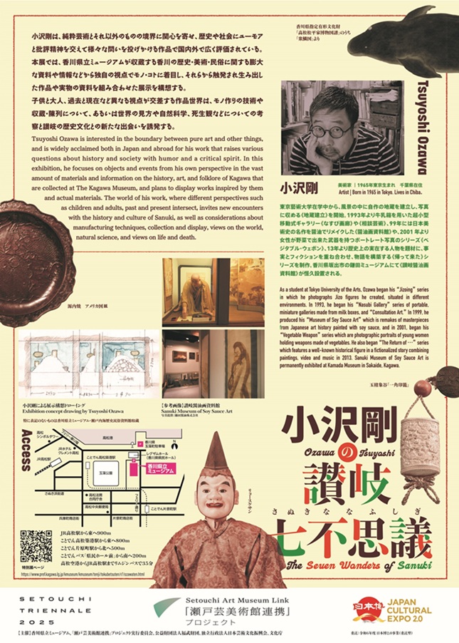 小沢剛は、純粋芸術とそれ以外のものの境界に関心を寄せ、歴史や社会にユーモアと批評精神を交えて様々な問いを投げかける作品で国内外で広く評価されています。本展では、当館の香川の歴史・美術・民俗に関する膨大な資料や情報などから独自の視点でモノ・コトに着目し、それらから触発され生み出した作品や実物の資料を組み合わせた展示を構想します。子供と大人、過去と現在など異なる視点が交差する作品世界は、モノ作りの技術や収蔵・陳列について、あるいは世界の見方や自然科学、死生観などについての考察と讃岐の歴史文化との新たな出会いを誘発します。