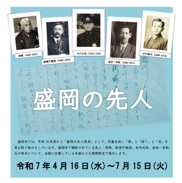 当館で収蔵している先人教育で採り上げている5人の先人(原敬・新渡戸稲造・米内光政・金田一京助・石川啄木)の手紙などを展示します。