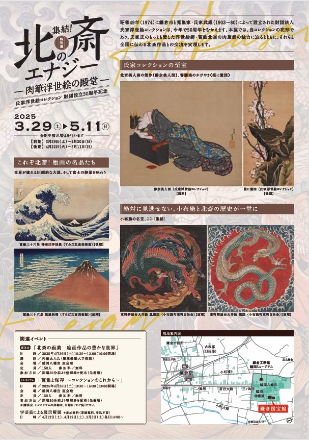 1974年に鎌倉市と蒐集家・氏家武雄(1903~80)によって設立された財団法人氏家浮世絵コレクションは50周年をむかえました。本展では、当コレクションの花形であり、氏家のもっとも愛した浮世絵師・葛飾北斎の肉筆画の魅力に迫るとともに、それらと全国に伝わる北斎作品との交流を実現します。