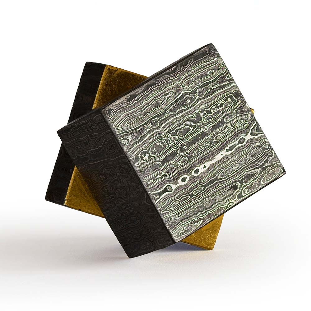 自作したダマスカス鋼の波状模様と端正な造形が織りなす世界を創作する加藤貢介氏。
