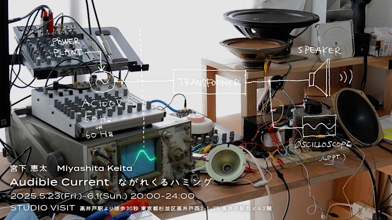 宮下恵太はこれまで、情報や電気、通信といった現代のインフラとしてのテクノロジーに焦点を当て、特定の機能を持ったシステムを構築することによりテクノロジーと人間の関係性について考察してきました。およそ3年ぶりの東京での個展となる本展では、電力会社によって供給される交流100Vの商用電源を音として鳴らすための装置を通じて、私たちの日常に流れ続けている通奏低音としてのインフラを再び前景化させることを試みます。