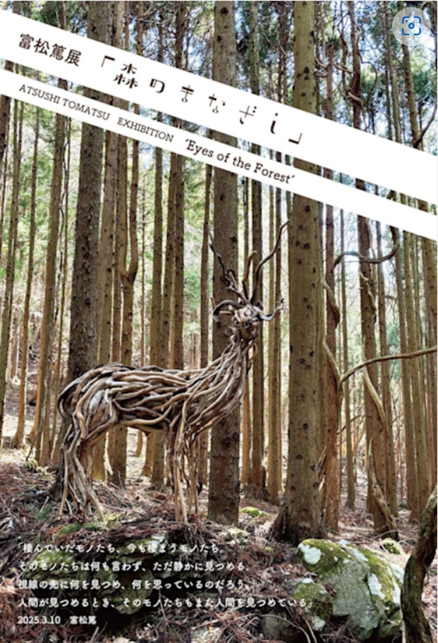流木はどのくらいの時を経て、いつどこからやってくるのか。集めた流木の中から一本一本手に取り、その曲線や質感のままに形づくっていく富松篤の制作風景からは、流木が宿す記憶への慈しみを感じる。2024年夏の「フォレストアートフェスティバル in ラダック」では、氷河が溶けて流れ着いた流木の長い旅の記憶を全て込めるように、その地の守り神のような野生生物「ヤク」を制作した。