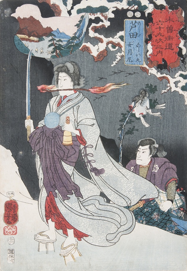 本展では、嘉永5年(1852)に刊行された三代豊国「木曽六十九駅」と国芳「木曽街道六十九次之内」を同時に公開します。両シリーズとも、説話や小説、歌舞伎演目などの登場人物を画面の主役としており、各宿場と人物のつながりを読み解く楽しさがあります。また、その多彩な内容からは、庶民間で共有されていた豊かな文化を垣間見ることができます。浮世絵を通して、江戸っ子たちを魅了し続けた江戸時代のエンターテインメントをご紹介します。
