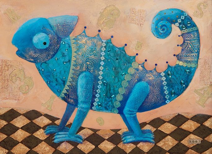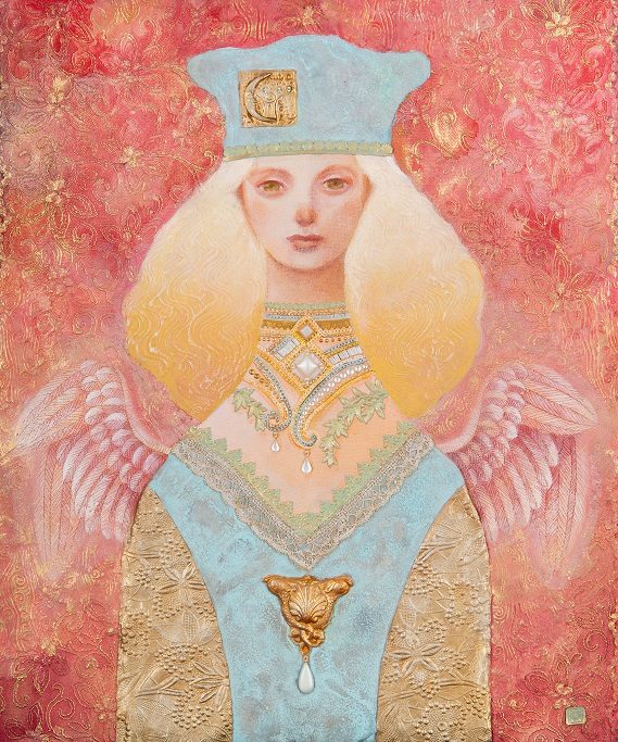 本展では、アクリル絵具にガラスや宝石をコラージュした作品や立体作品を約30点集め発表いたします。