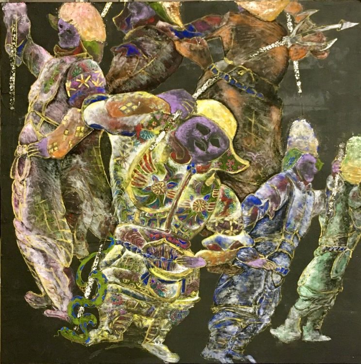 雲肌麻紙、岩絵具、水干絵具、アクリル絵具、金泥、銀箔、モデリングペースト