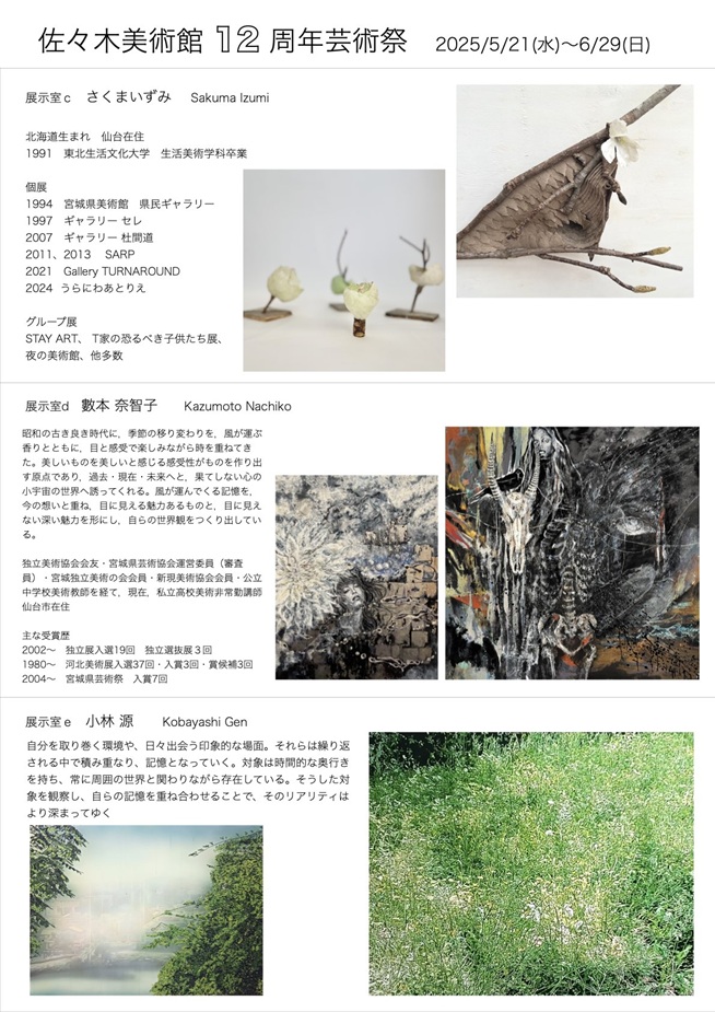 「佐々木正芳オマージュ展」終了後、美術館本館では毎年恒例の周年芸術祭を開催いたします。12周年を記念して今年は、さくまいずみさん、數本奈智子さん、小林源さんの3名の素晴らしい作家をお迎えして開催いたします。