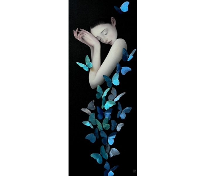 木漏れ日や水面の揺らぎなど光と影を表現した世界、粗めの粒子で創る密度の高い黒の背景に描かれる動物たちや人物の世界、平面の画面に立体の蝶を組み合わせたミクストメディアの世界を表現する日本画家の坂本藍子氏。札幌三越初個展の本展は、代表作のモルフォ蝶の作品をはじめ、人物など一堂に展覧いたします。粒子の粗い絵の具を使用して描かれた作品は、自然光や光があたると絵の具が反射してキラキラと光ります。これから迎える夏に最適な爽やかな光と影のコントラストが生み出す幻想的な坂本藍子氏の青の世界をどうぞご高覧ください。