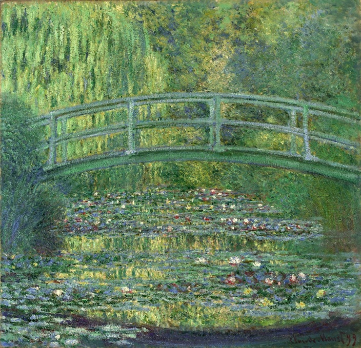 19世紀後半、近代化の進むパリで、クロード・モネ(1840-1926)やピエール・オーギュスト・ルノワール(1841-1919)ら印象派の画家たちは、移ろいゆく光や豊かな色彩にあふれた革新的な表現を切り開きました。屋外で憩う人々の姿を明るい色彩と素早い筆致でとらえた彼らの作品は、新しい時代の絵画として高く評価されました。その後、モネは同じモティーフを光の変化に応じて繰り返し描く「連作」に挑戦します。晩年には自宅に造成した池に咲く睡蓮を描き、水面に映る光と草花の揺らめきを絵画に表現しました。