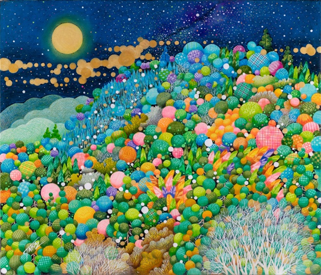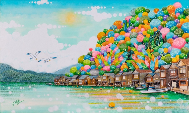 色鮮やかで活き活きとした花鳥百獣の世界を描く画家、佐藤潤。動物にまつわる吉祥や風習、縁起物などを取り入れた新し子供の頃読んだ漫画が絵との出会いでした。そのデフォルメされたフォルムが楽しく、可愛いらしく心踊る程好きでたまりませんでした。いまだに忘れられない感覚です。その感覚を作品に転化出来ないものかと日々奮闘して描いている次第です。観る人の心を弾ませることかできればとても嬉しいです。