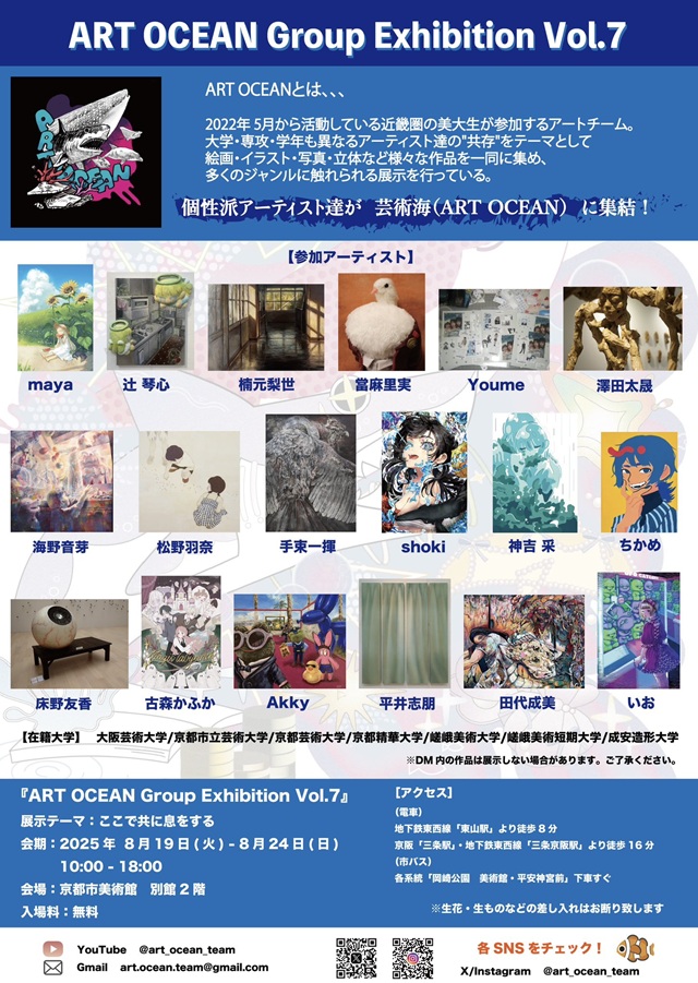 成安造形大学イラストレーション領域学生 参加、近畿圏の美大生で構成するアートチーム「ART OCEAN」による展示『ART OCEAN Group Exhibition Vol.7 「ここで共に息をする」』が京都市美術館 別館2階にて開催されます。ぜひ、ご覧くださART OCEANとは・・・