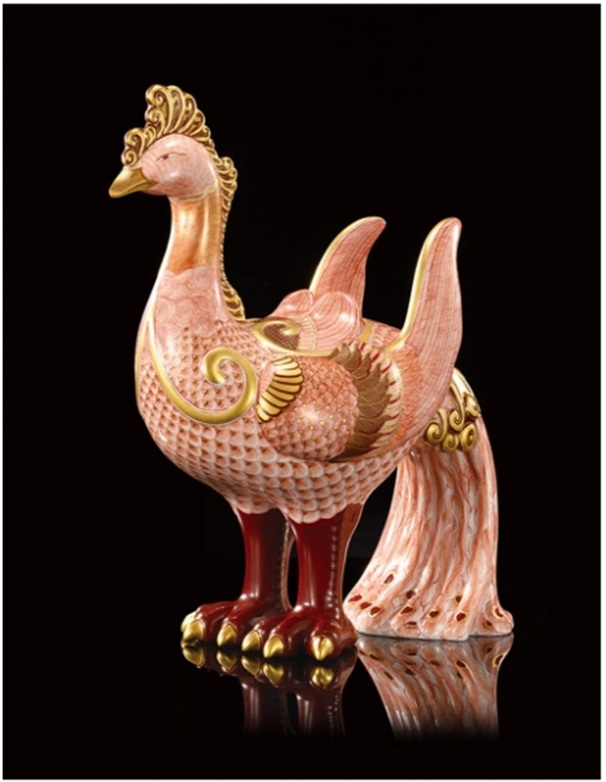 赤絵の仕事を始めたころ、一目惚れした鳳凰の生地を2体だけ手に入れました。しかし30年という時間を経過すると九谷の地でも、時代の流れで作り手がいなくなり同じものが手に入らなくなりました。先代たちが作り上げた素晴らしい造形を現代にも遺していきたいと思い、思い切って生地を復刻することにしました。光り輝く未来という遠くを見守り続けるような佇まいを、繊細な赤絵細描で描くことによって凛とした鳳凰の品格と華やかさを表現することができた作品になりました。米久和彦