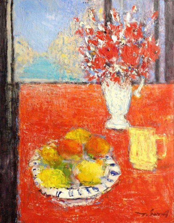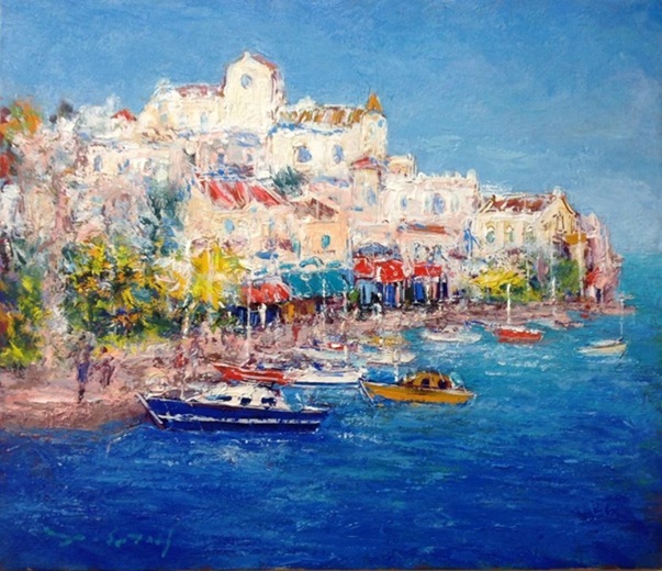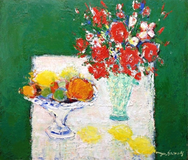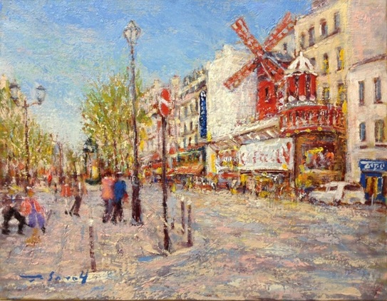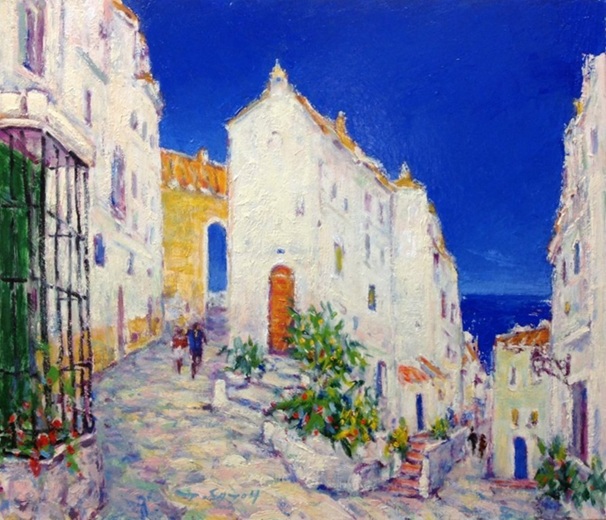 南欧各地を取材し、艶やかな色彩で地中海やパリの街角など光と風を感じる風景画を描いたり、明るい卓上の花々やおしゃれな静物画を制作したりしている佐藤隆春。「遠い旅の記憶がキャンバスに甦るこの感動は、描くしか、絵でしか伝えられない綺麗で重厚なものだと、若い時から常にそう思って描いてきた。限りあるから今も描ける」と想いを寄せるように、旅先でのデッサンをアトリエに持ち帰り、美しさと詩情に満ちた感動をキャンバスに表現しています。