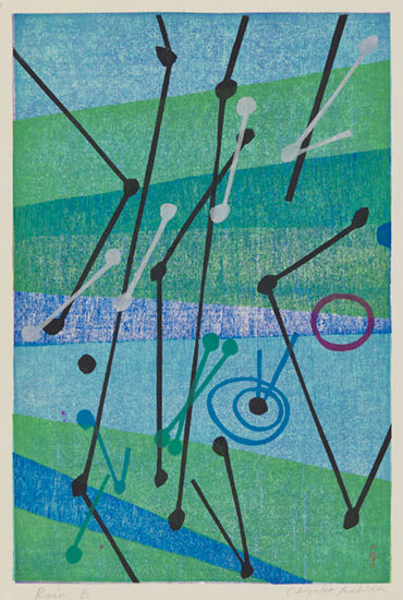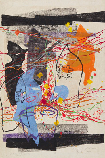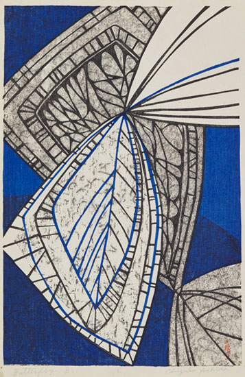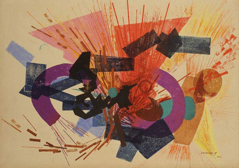 こうした千鶴子の創作活動は、1953年に版画家・𠮷田穂高(1926-1995)と結婚したことで大きく変化します。1950年代に入り日米間の文化交流が活性化するなかで、千鶴子は𠮷田家の一員として版画制作に携わり、色彩感覚に優れた完成度の高い抽象版画を数多く生み出しました。1956年には日本で初の女性による版画団体である女流版画会を結成(65年まで活動)。1967年から一家で三鷹市井の頭に居住し、晩年まで当地で制作活動を継続します。1970年グレンヘン国際色彩版画トリエンナーレ展で受賞を果たし、1970年代後半から開始した身近な生きものや植物を題材にした作品は幅広い層から支持され、その創作意欲は晩年まで尽きることがありませんでした(2017年没)。