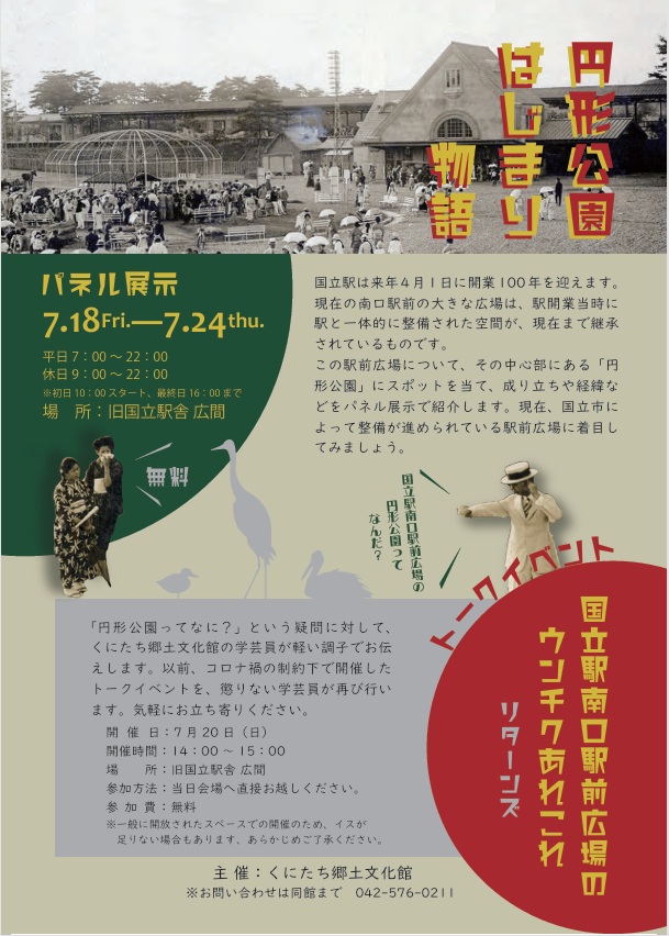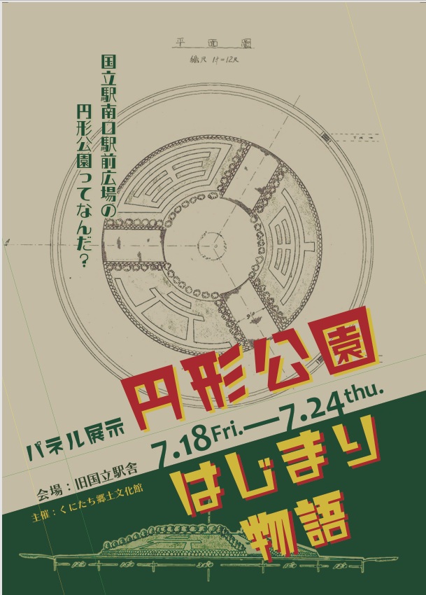 この駅前広場について、その中心部にある「円形公園」にスポットを当て、成り立ちや経緯などをパネル展示で紹介します。現在、国立市によって整備が進められている駅前広場に着目してみましょう。