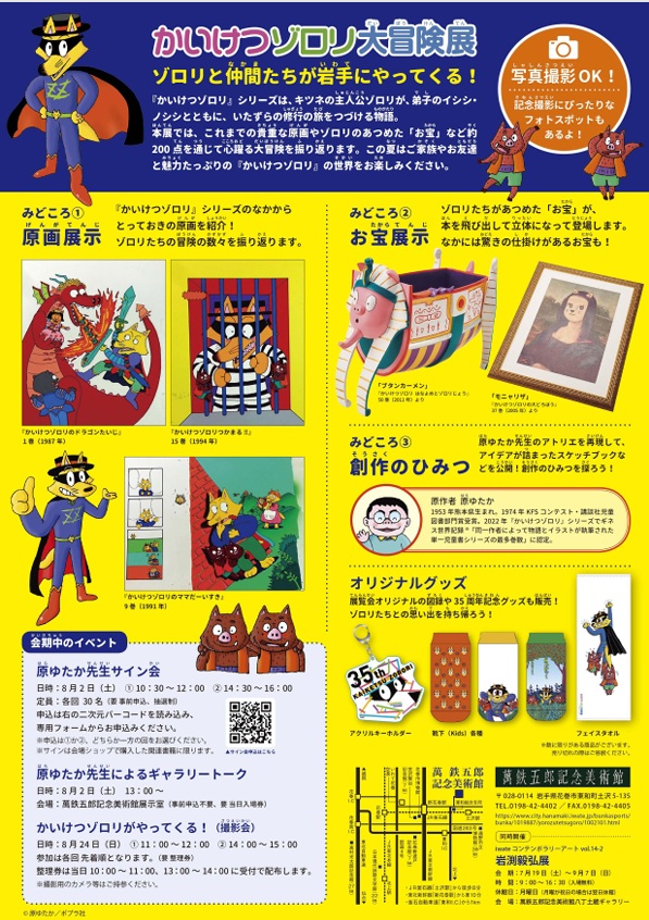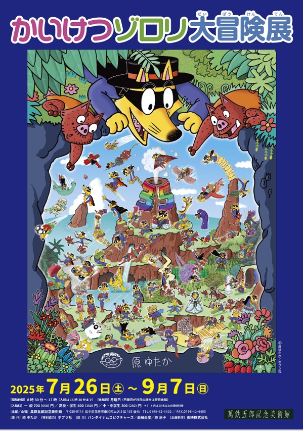 本展では、これまでの貴重な原画やゾロリの集めた「お宝」など約200点を展示し、心躍る大冒険を振り返ります。この夏は、ご家族やお友達と魅力たっぷりの『かいけつゾロリ』の世界をお楽しみください!