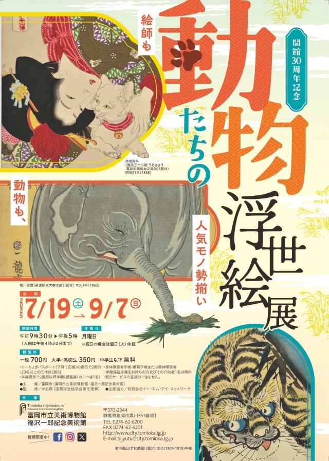 名称:開館30周年記念「動物たちの浮世絵展 絵師も動物も人気モノ勢揃い」富岡市立美術博物館・福沢一郎記念美術館