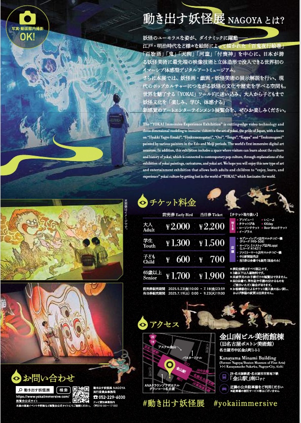 江戸・明治時代など様々な絵師によって描かれた「百鬼夜行絵巻」「百物語」「鬼」「天狗」「河童」「付喪神」などの日本が誇る妖怪美術に最先端の映像技術と立体造形で没入できる世界初のイマーシブ体感型デジタルアートミュージアムです。