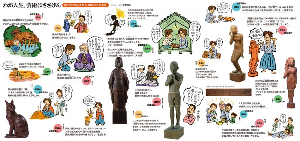 生涯のほとんどを故郷の伊勢で過ごした橋本平八は、周囲の豊かな自然に刺激を受け、古代彫刻や古今東西の哲学に学びながら独自の思想を深めました。自然や生命の神秘について洞察を重ねた作品の数々は、今もなお多くの人を惹きつけています。