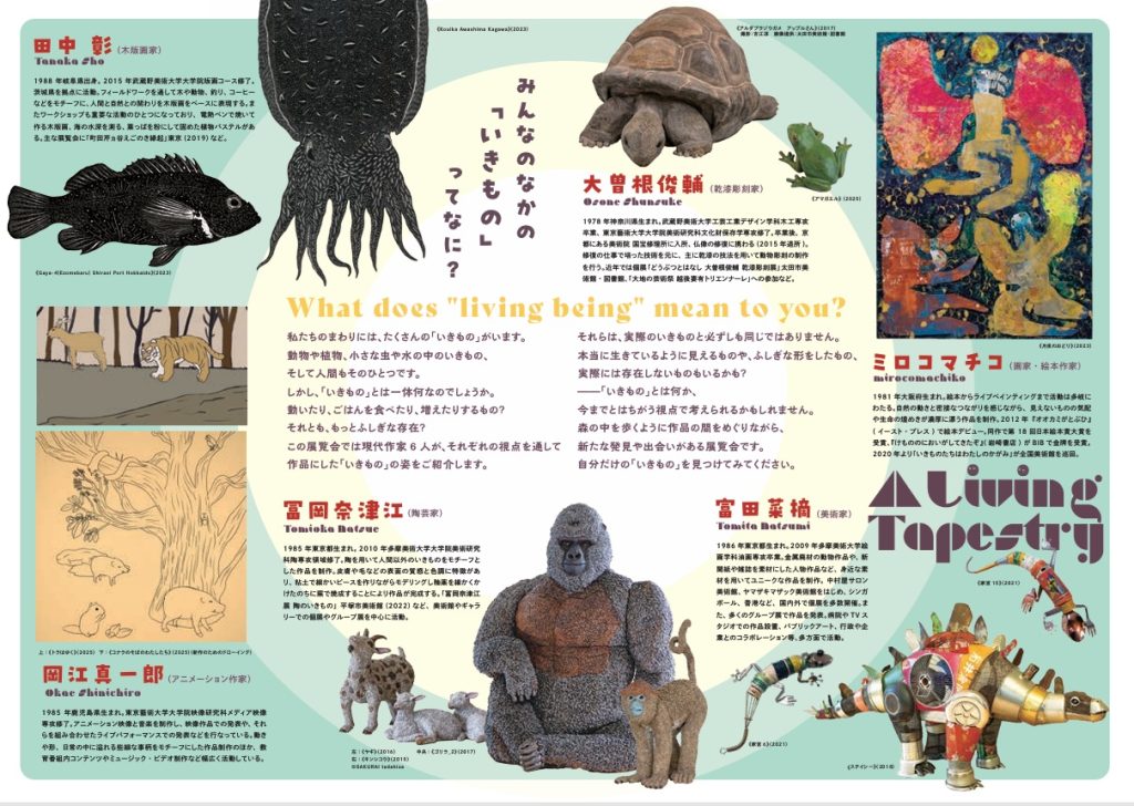 この展覧会では現代作家6人が、それぞれの視点を通して作品にした「いきもの」の姿をご紹介します。それらは、実際のいきものと必ずしも同じではありません。本当に生きているように見えるものや、ふしぎな形をしたもの、実際には存在しないものもいるかも?——「いきもの」とは何か、今までとはちがう視点で考えられるかもしれません。森の中を歩くように作品の間をめぐりながら、新たな発見や出会いがある展覧会です。自分だけの「いきもの」を見つけてみてください。