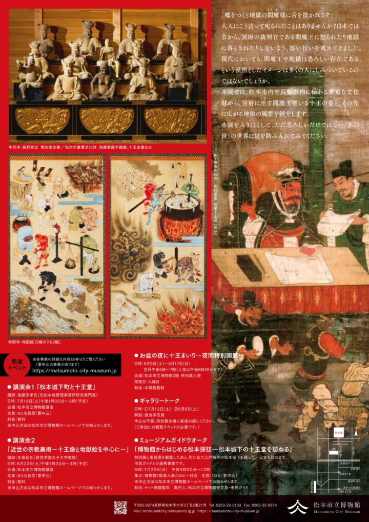 本展では、松本市内や長野県内に伝わる貴重な文化財から、冥府に坐(いま)す閻魔王率いる十王の姿と、その先に広がる地獄の風景を紹介します。盆行事などを通して人の死について思いを巡らせる機会が多くなるこの夏の時期に、本展を入り口として、ただ恐ろしいだけではない「あの世」の世界に足を踏み入れてみてください。