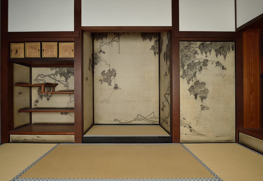 本展では、その中から足利将軍コレクション「東山御物」の唐物茶器をはじめ、室町から江戸時代の仏教美術、そして伊藤若沖や円山応拳、長沢芦雪らの江戸絵画など約70点を紹介します。若沖の重要文化財《鹿苑寺大書院障壁画 一之間 葡萄小禽図床貼付》など、道内初公開の寺宝も多数展覧します。相国寺が伝えてきた禅宗文化の深い精神性や応仁の大乱後の文化復興のなかで花開いた若冲らによる個性的な江戸絵画の魅力を深く味わう機会となるでしょう。