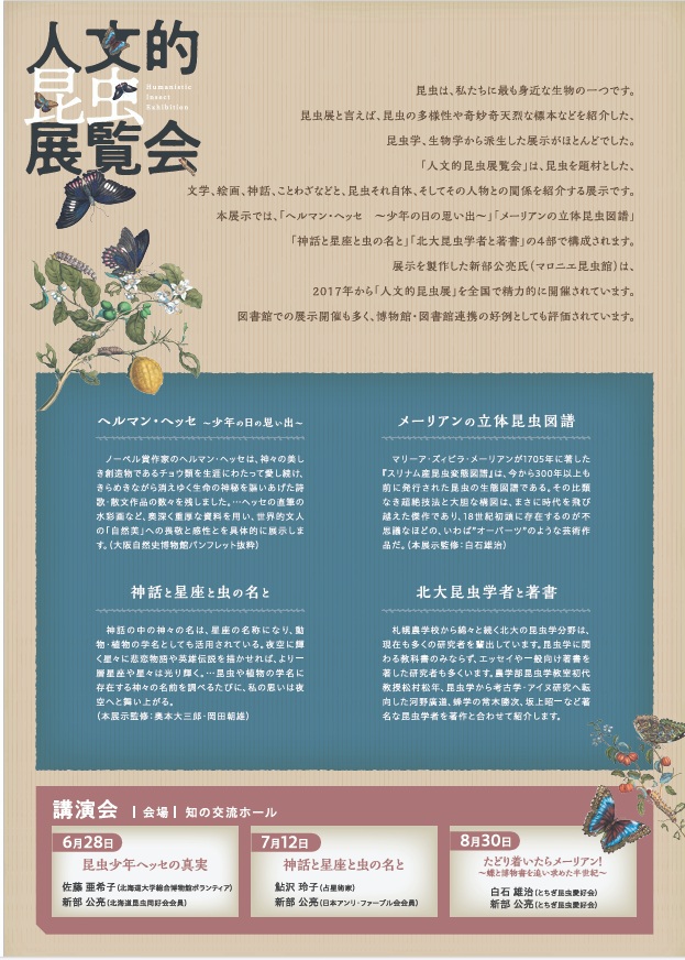 展示を制作した新部公亮氏(マロニエ昆虫館)は、2017年から「人文的昆虫展」を全国で精力的に開催されています。図書館での展示開催も多く、博物館・図書館連携の好例としても評価されています。