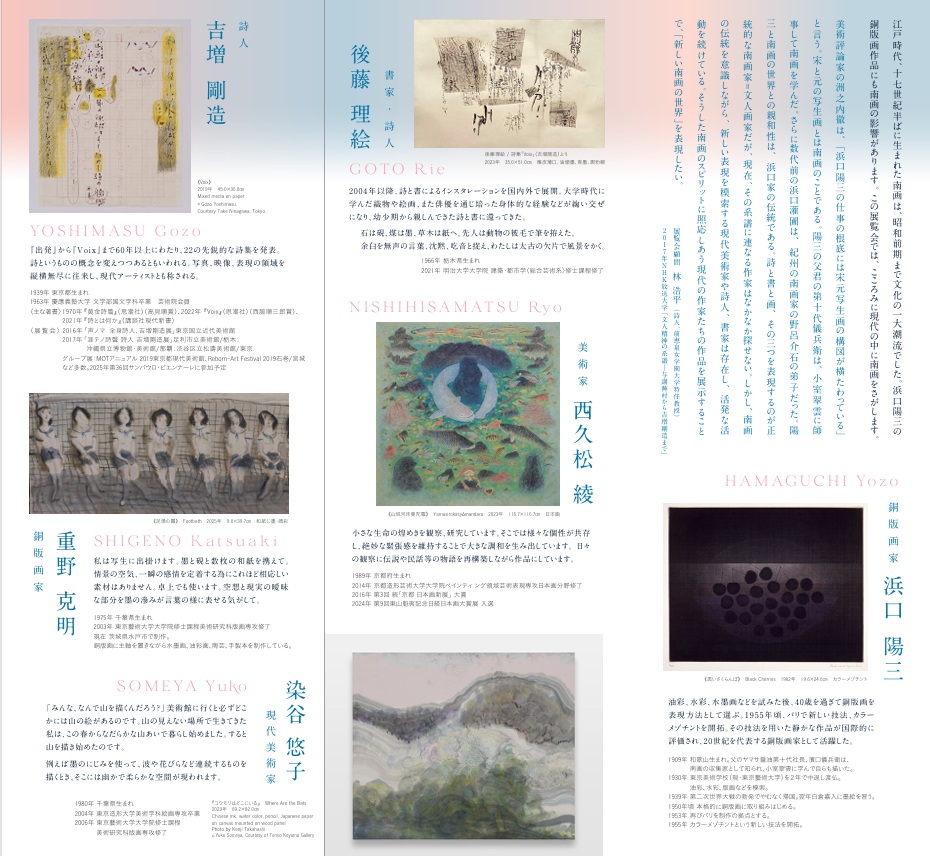 そうした南画のスピリットに照応しあう現代の作家たちの作品を展示することで、「新しい南画の世界」を表現したい。