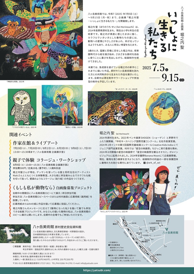 3歳のとき、猛獣と恐竜に恋をした堀之内は、 保育園時代から絵を描き始め、さまざまな画材を自由 に使うことに喜びを見出しながら、絵画制作を続けてきました。 本展では、急成長を遂げている堀之内の新作とこれまでに描いた作品、原村や八ヶ岳美術館を訪れた方との共同制作から生まれた作品を展示いたします。